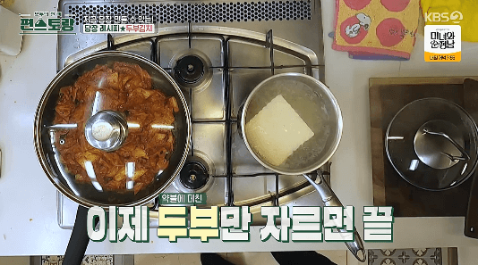 15. 두부를 먹기 좋게 썰고, 볶음김치를 함께 접시에 담아줍니다. (어남선생 류수영씨는 두부를 세모 모양으로 썰었는데, 자세한 써는 과정은 영상으로 확인할 수 있습니다.)