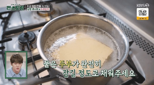 3. 물이 끓으면 약불로 낮춰서 데쳐줍니다. 두부 속까지 충분히 데워지도록 볶음김치가 완성될 때까지 쭉 데쳐줍니다.