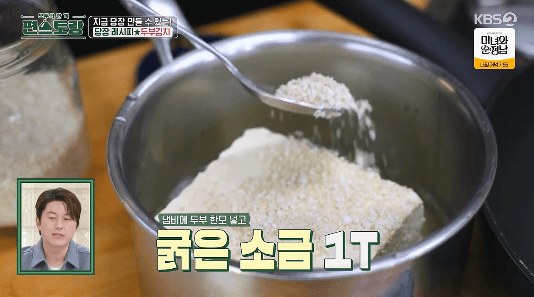 1. 냄비에 두부 1모, 굵은소금 1큰술을 넣고 두부가 잠김 정도의 물을 부어줍니다.