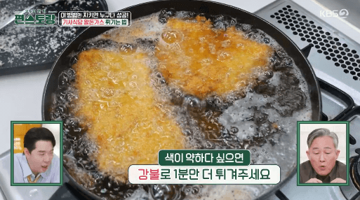 20. 돈가스를 넣고 중약불에서 7분간 튀겨줍니다. 튀김옷이 분리될 수 있으므로, 처음 1~2분간은 건드리지 않고 그대로 둡니다.