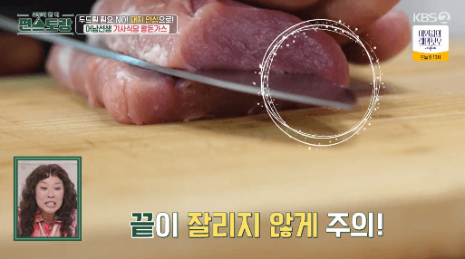 3. 고기를 눕혀놓고, 반 가르듯 가로로 깊게 칼집을 냅니다. (고기 끝이 잘리지 않을 만큼 칼집을 냅니다.)