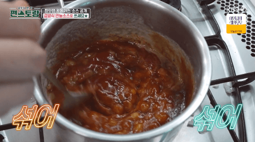 7. 시판 소스마다 맛이 다르므로 간을 보고, 돈가스 소스와 케첩을 2:1 비율로 추가합니다. 약간 싱거운 정도로 간을 맞춰야 질리지 않고 먹을 수 있습니다.