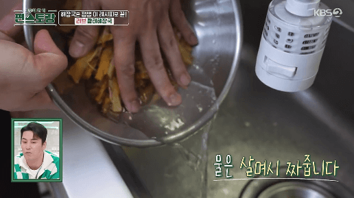 2. 자른 황태채를 물에 헹구고, 물을 따라냅니다.