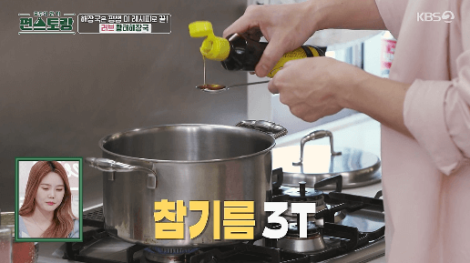 7. 약불로 불을 줄이고, 참기름 3큰술을 냄비에 넣습니다.