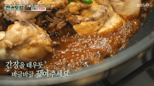 12. 간장을 바글바글 끓이다가, 주걱을 사용하여 닭을 볶아줍니다.