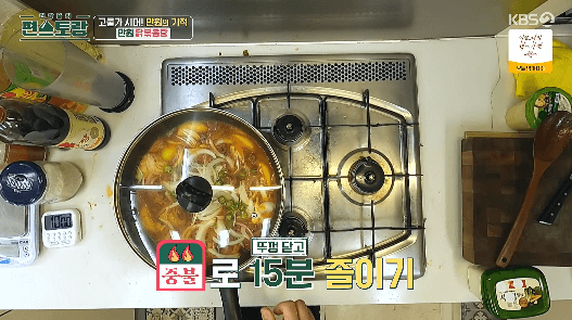 21. 불을 중불로 줄이고, 뚜껑을 덮고 15분 더 끓여줍니다.