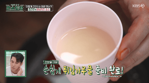 5. 물 100ml에 튀김 가루 1/2큰술을 넣고 뭉치지 않게 잘 섞어서 튀김가루물을 만들어줍니다.