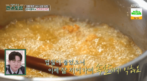 13. 2분이 지나면 튀김옷이 닭과 붙었으므로, 닭을 저어가며 속까지 익혀줍니다.