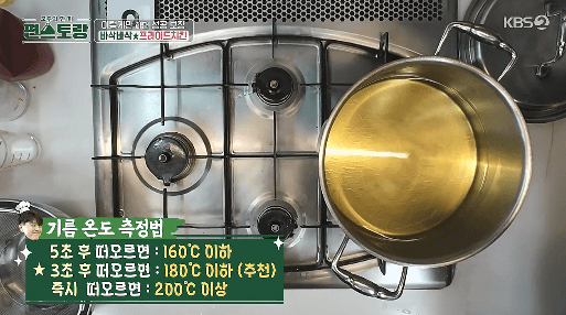 9. 180도가 튀김을 하기 적절한 온동입니다. 온도계로 체크해도 되고, 반죽의 작은 덩어리를 넣어서 3초 후에 떠오르면 적당한 온도입니다. (온도체크 하는 과정은 영상으로 확인하세요.)
