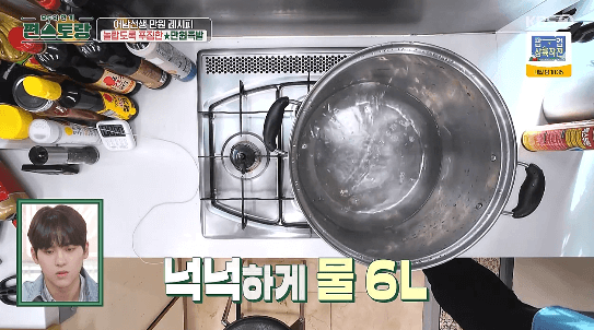 7. 대용량 솥을 준비하고, 물 6리터를 부어줍니다. 강불에 물을 끓여줍니다.