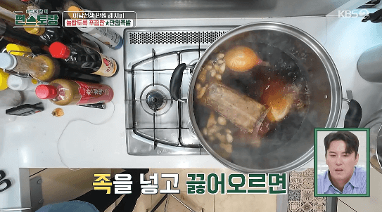 16. 돼지 족발을 넣은 뒤 양념물이 끓어오르면, 30분 동안 뚜껑을 열고 끓여줍니다.