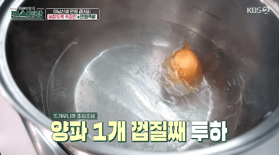 9. 물이 끓으면 양파 1개를 넣습니다. 뜨거운 물이 튀지 않도록 살살 놓아줍니다.