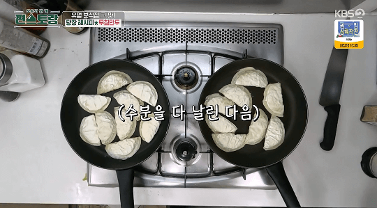 6. 예열된 팬에 만두를 넣고, 수분을 날려줍니다. 기름부터 두르지 않습니다. 이렇게 하면 만두를 구을 때 기름이 튀지 않습니다.