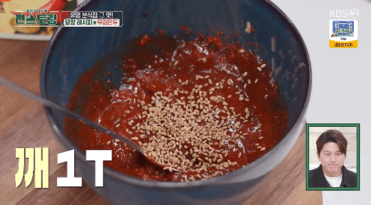 3. 고추장 듬뿍 1큰술, 깨 1큰술을 넣고 골고루 섞어줍니다.