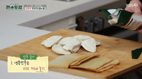 1. 냉동 군만두를 미리 꺼내서 상온에서 해동합니다. 붙어있던 얼음조각을 녹여 기름에 튀는 걸 방지할 수 있습니다.