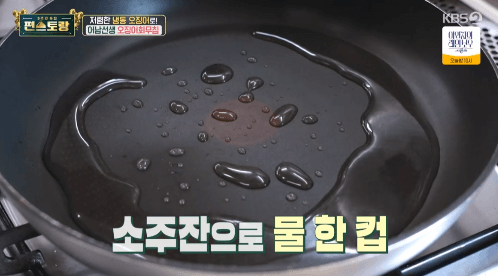 9. 프라이팬에 물 50ml (소주잔 한 컵)를 붓고, 강불에 끓입니다.
