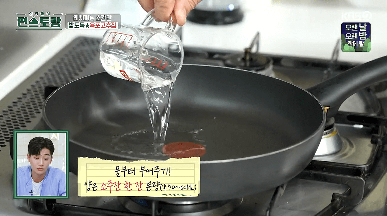4. 프라이팬에 소주 한잔 정도의 물을 부어줍니다. (50ml~60ml)