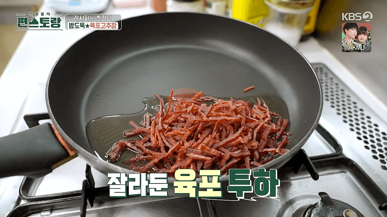 5. 프라이팬에 육포를 넣고, 볶아줍니다. 말라있는 육포를 물에 불려, 식감을 부드럽게 하기 위한 과정입니다.