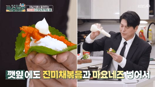 13. 어남선생 류수영씨가 진미채볶음 맛있게 먹는 방법을 소개했는데요. 김이나 깻잎 위에 밥과 진미채볶음을 올리고, 마요네즈를 콕 찍어서 먹으면 맛있게 진미채볶음을 먹을 수 있습니다.