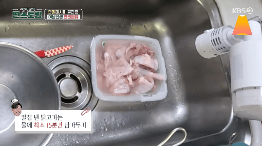 4. 칼집 낸 닭은 물에 15분 이상 담가둡니다.