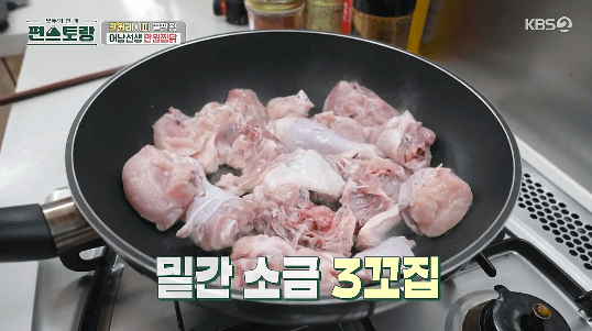 11. 닭을 다 넣고, 소금 3꼬집을 뿌려 밑간을 해줍니다. 닭을 뒤적이지 말고, 그대로 1~2분 정도 구워줍니다.