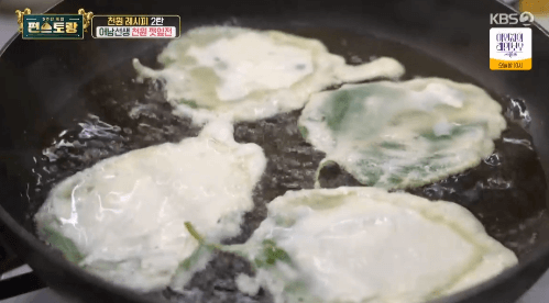 6. 깻잎을 앞뒤로 반죽물을 묻히고, 팬에 올립니다.
