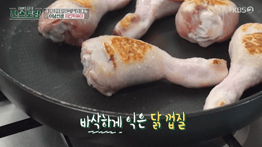1. 프라이팬을 강불로 예열한 뒤 닭다리를 올려줍니다. 뒤집지 말고 1~2분 정도 그대로 놔둡니다.