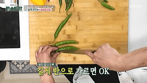 22. 고추를 길게 반으로 가른 뒤 속에 있는 씨를 제거합니다.