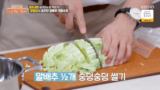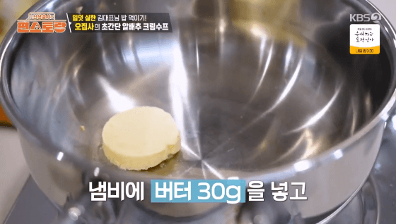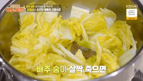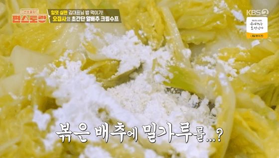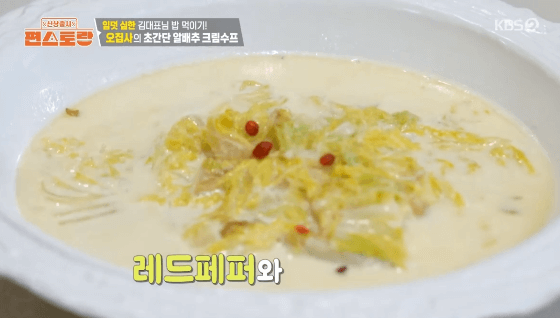 오상진씨가 둘째 아이를 갖은 아내 김소영씨를 위해서 요리를 준비했는데요. 의외의 재료로 스프를 만들었습니다. 바로 알배추입니다. 배추로 스프라?! 생소한데요. 그런데, 맛있데요. 매콤한 맛을 원한다면 청양고추 오일을 곁들여 보세요.