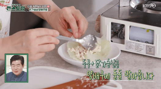 8. 찐 양배추를 넓게 펼친 뒤 두부와 닭가슴살 볶은 것을 올려줍니다.