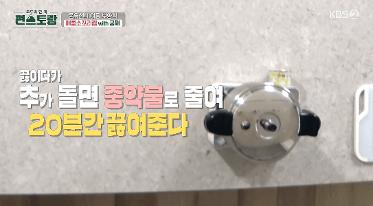 10. 추가 돌면 중약불로 줄이고 20분 더 끓인 뒤 불을 끕니다. 추를 젖혀서 압을 빼줍니다.