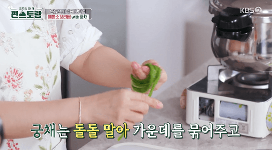 18. 불린 궁채는 돌돌 말아서, 가운데를 묶어줍니다.