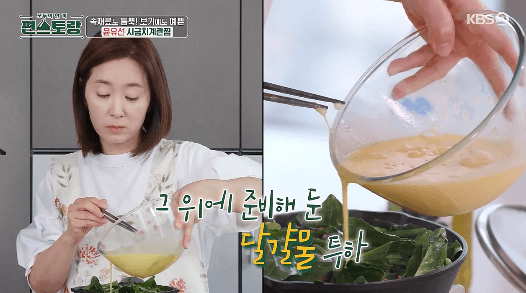 시금치를 넣은 계란찜이라고 하니, 뭘까 궁금증이 생겨납니다. 일반적으로 알고 있는 계란찜은 물에 계란을 풀어 넣고 끓이는 방식인데, 시금치를 넣고 끓이는 건가 싶습니다. 그런데, 윤유선씨의 계란찜은 프라이팬에 만들어서, 약간 피자 같은 느낌이 듭니다. 어떻게 만드는 걸까요?