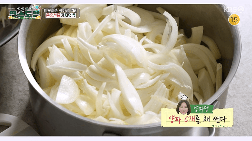 1. 껍질 벗긴 양파 6개를 얇게 채 썰어서 냄비에 담습니다.
