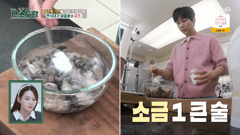 3. 볼에 굴을 담고, 물을 붓습니다. 소금 1큰술을 넣고 잠시 놔둡니다.