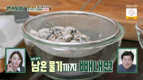 4. 굴을 체에 밭쳐 물기를 뺍니다.