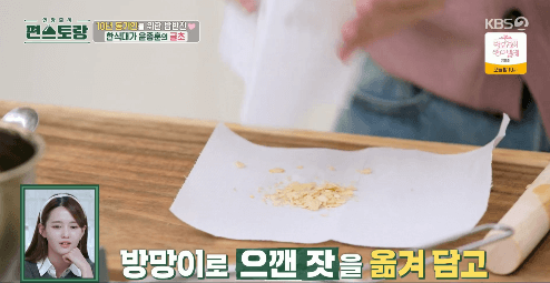 16. 키친타월을 새것으로 교체한 뒤 잣가루를 옮겨 담습니다.
