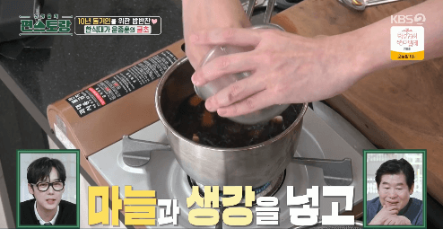 11. 간장 조림장이 끓기 시작하면, 썰어 놓은 마늘과 생강을 넣습니다.