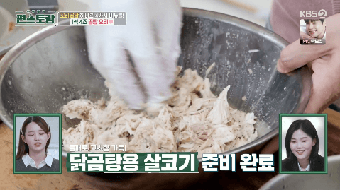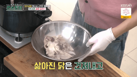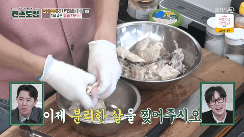 2. 삶은 닭을 건져서, 살을 결대로 찢어줍니다.