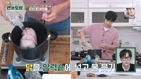 1. 압력솥에 닭을 넣고, 물을 붓고 30분간 끓입니다.