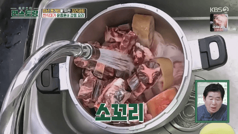 7. 압력솥에 우족과 소꼬리가 잠길 정도의 물을 넣고 1시간 동안 끓입니다. 추가 울리면 약불로 줄이고 끓입니다. 1시간 끓인 뒤에는 불을 끄고 뜸을 들입니다.