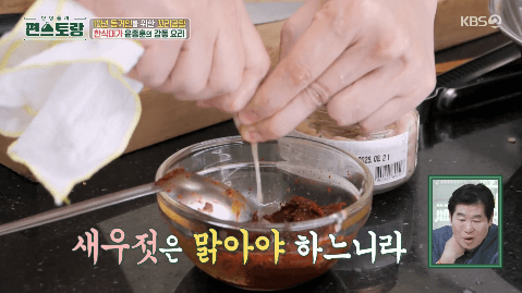 14. 새우젓을 곱게 다지고, 면포에 짠 뒤 양념장에 새우즙을 넣어줍니다.