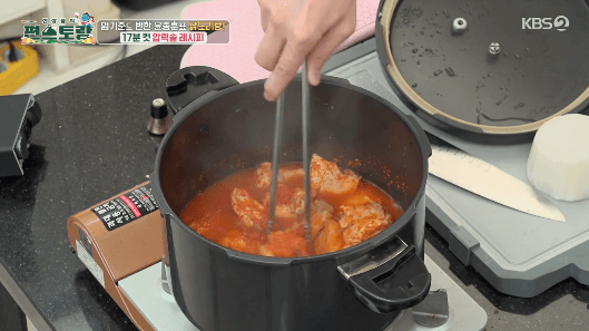 18. 5분 뒤 압력솥 김을 빼고, 뚜껑을 엽니다.