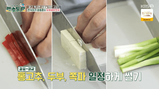4. 두부는 찌개용 크기로 깍둑썰기하고, 쪽파는 4cm 길이로 썰어줍니다.