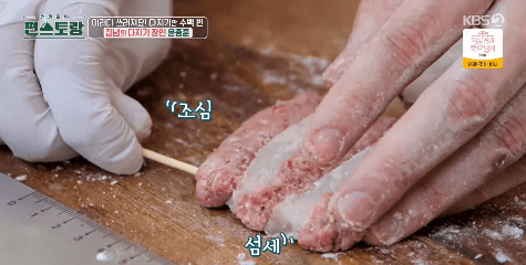 14. 치댄 고기를 넓게 직사각형 모양으로 잡아주고, 긴 막대모양으로 잘라줍니다.