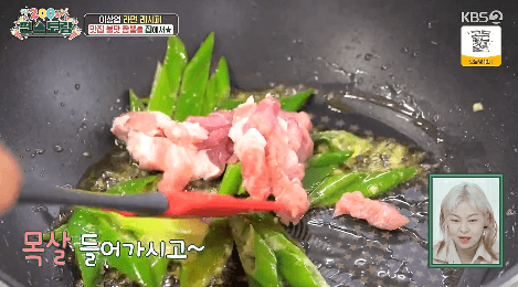6. 돼지고기 목살도 넣고 볶다가 목살이 익으면 청양고추를 넣고 볶습니다.