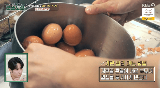 5. 많은 양의 계란을 까기 위해, 냄비를 들고 흔들어줍니다. 껍질이 깨지도록 해줍니다.