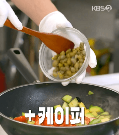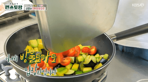 5. 애호박과 가지가 어느 정도 익으면 방울토마토, 케이퍼, 블랙 올리브를 넣고 소금, 후추로 간을 해줍니다.