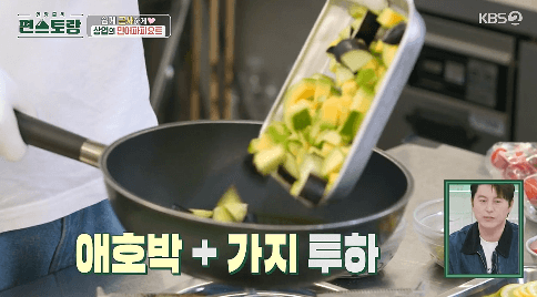 4. 예열된 팬에 식용유를 두르고, 애호박과 가지를 넣고 볶습니다.