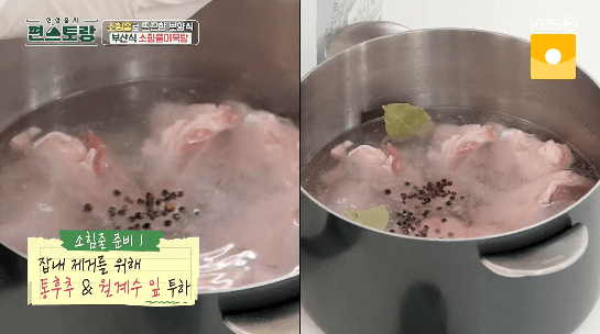 2. 2시간 정도 핏물을 뺀 소힘줄에 월계수 잎, 통후추, 약간의 소주를 넣고 15분간 초벌 삶기를 합니다.